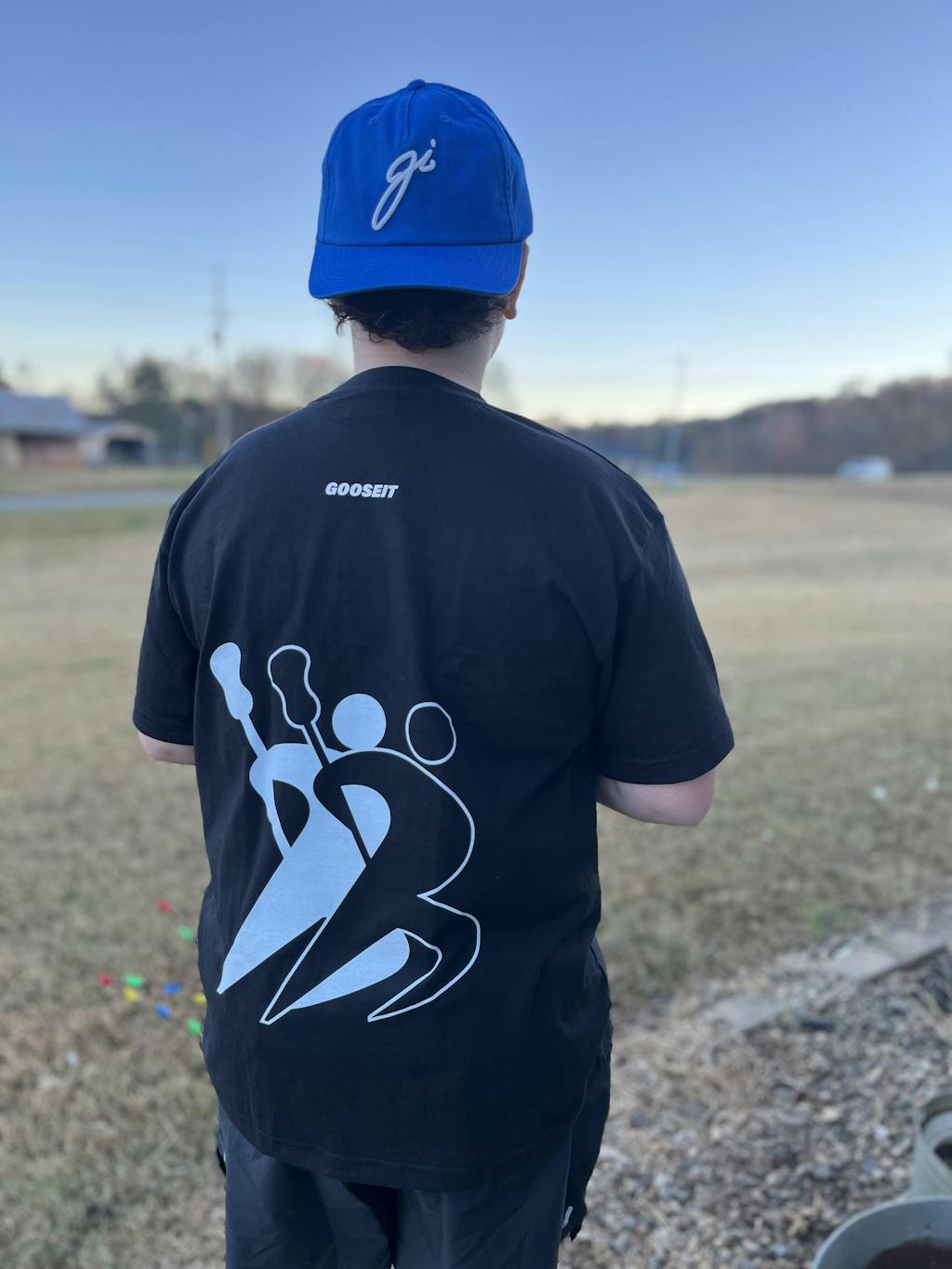 The Silhouette Tee captures the fluidity of lacrosse through abstract movement — two stylized figures, each holding a stick, printed across the back. A subtle Goose It logo sits at the neckline.